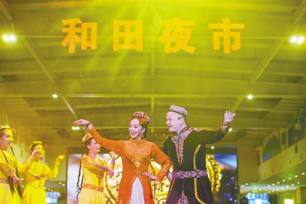 3月16日,在和田夜市环湖店,舞蹈演员表演节目。