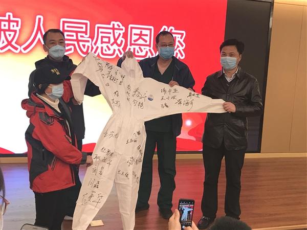 欢送仪式上,即将离开黄陂的周口、商丘、河北医护人员共同在一件防护服上签字,留赠给黄陂疫情防控指挥部,这件防护服将被永远保存在黄陂区博物馆。