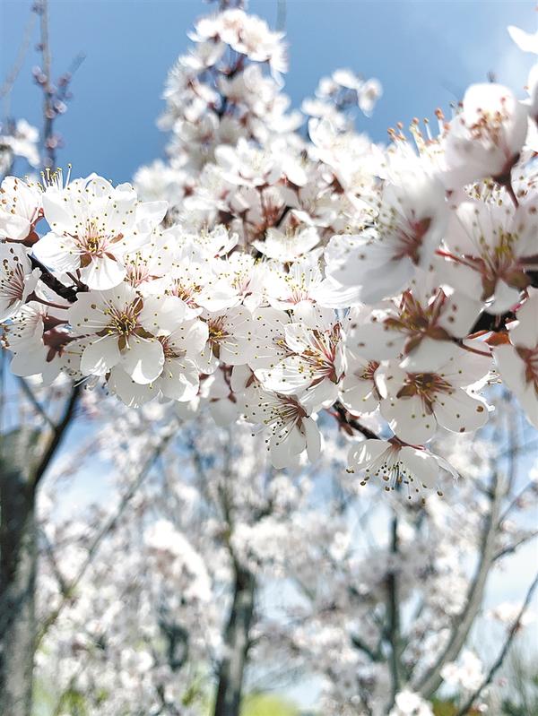 “一叶春风吹动蕾,红叶李花妍漫天。”红叶李又名紫叶李,属蔷薇科。走近观看,细细密密的粉白色繁花开满枝头,在紫色叶子的衬托下,显得别致、靓丽。远远望去,像是烂漫层叠的樱花,又宛如飘落大地的云霞,为春天平添几分妩媚、几分浪漫。
