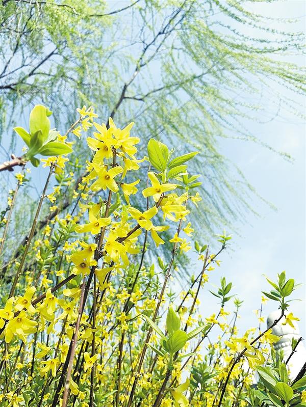 作为春天的信使,一丛丛娇黄的连翘花,为大地带来了浓浓春意。花朵在春风的吹拂下摇曳,团团簇簇,涌动如金色波浪。走近之时,闻花香淡雅、赏满枝金黄,人们也以“报春花”来称呼它。