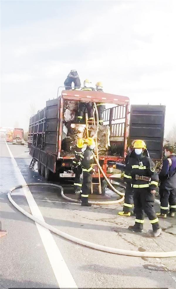 本报讯 3月19日,大广高速周口段一辆半挂货车在行驶途中所载货物突然起火,经过紧急救援大火被扑灭,但所载货物损毁严重。
