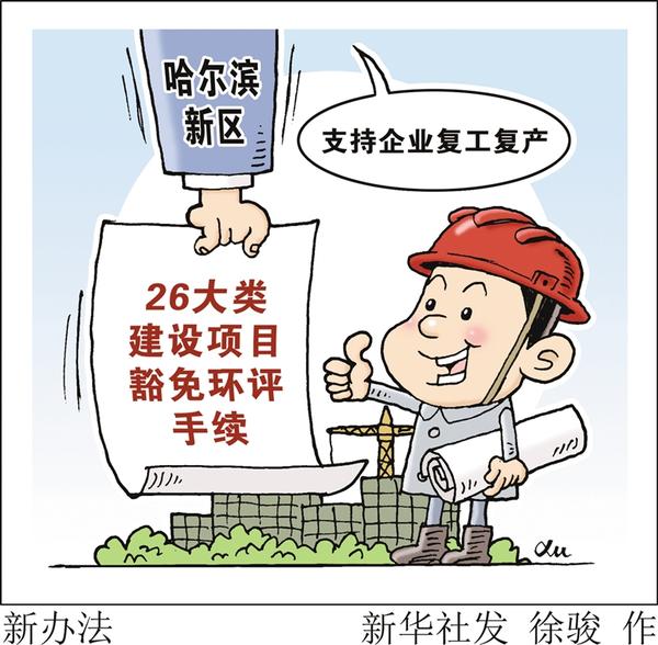 为支持企业复工复产,哈尔滨新区近日实施新办法,对量大面广、生态环境影响较小的项目应放尽放、应简则简,共26大类建设项目无须办理环境影响评价手续,有关部门将相应加强事中和事后监管。