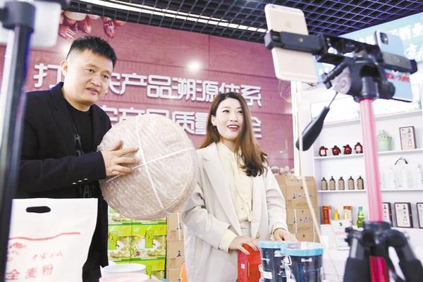 足不出户就可将土特产卖往全球,近日,郸城县电子商务产业园开展电商销售项目。据了解,该项目投资8亿元,预计年营业额达6亿元。图为一电商直播卖土特产。记者 梁照曾 摄