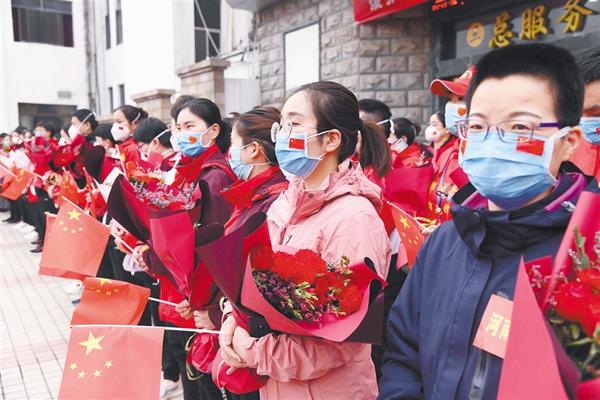 援鄂医疗队队长闫登峰说:“30多天,我们的71名队员克服初到武汉时的生疏与紧张,不畏工作强度大、不畏感染风险高、不畏身着防护用品的闷热缺氧,守光谷、战黄陂,始终以饱满的热情和乐观的精神,与同袍战友一起,用良好的专业素养诊治、护理新冠肺炎患者,共同遏制疫情蔓延。”