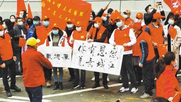 欢迎队伍和闻讯赶来的市民,有的手拿国旗,有的手拿写有“欢迎援鄂医疗队凯旋归来”“欢迎英雄回家”“春暖花开日 将士凯旋时” “欢迎回家”等字样的条幅,迎接援鄂英雄。