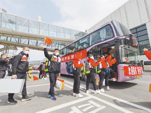 12时20分,专机到达新郑机场,援鄂医疗队队员高唱着《歌唱祖国》上车。