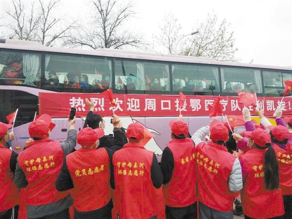 3月30日下午2时许,在周口迎宾馆门前路两侧,周口市中心医院、周口市中医院、周口市第五人民医院等单位的职工早早地排成两队,手持红旗,欢迎英雄回家。“我的同事真是太棒了,也太不容易了,真的很感谢他们,我每天都看新闻,期待他们早日胜利归来,他们是我们的兄弟姐妹,看到他们平安归来我真的有说不出的开心。”周口市中心医院护士李女士激动地说。