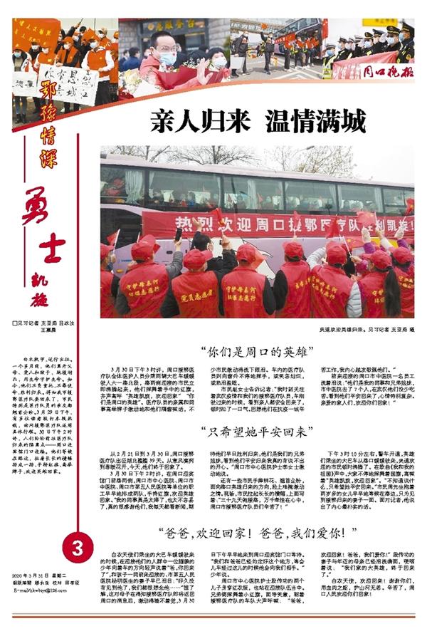 3月30日下午3时许,周口援鄂医疗队全体医护人员分乘两辆大巴车缓缓驶入六一路北段,路两侧迎接的市民立即沸腾起来,他们挥舞着手中的红旗,齐声高呼“英雄凯旋,欢迎回家”“你们是周口的英雄”。医疗队员的亲属和同事高举牌子激动地和他们隔窗喊话,不少市民激动得流下眼泪。车内的医疗队员则向窗外不停地挥手,或笑容灿烂,或热泪盈眶。