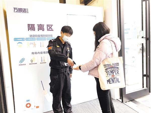 在万顺达广场入口处,一名身穿制服、佩戴口罩的工作人员对进入商场的顾客进行手部消毒。记者了解到,该商场在整体环境、物资配套、员工防护等方面均采取了严格的防疫措施,如顾客进入商场时未佩戴口罩,会被工作人员口头提醒,没有口罩的消费者,商场会免费为其发放口罩。在昌建MOCO新世界某火锅店,记者看到,一名手拿额温枪的服务员对食客进行扫描测温,如果体温异常,会被禁止入内。