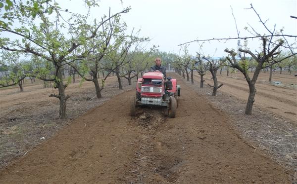 4月1日,沈丘县周营镇久酒中梁农业开发有限公司一处生态林果园基地内,果农正在松土整地,以套种春花生。