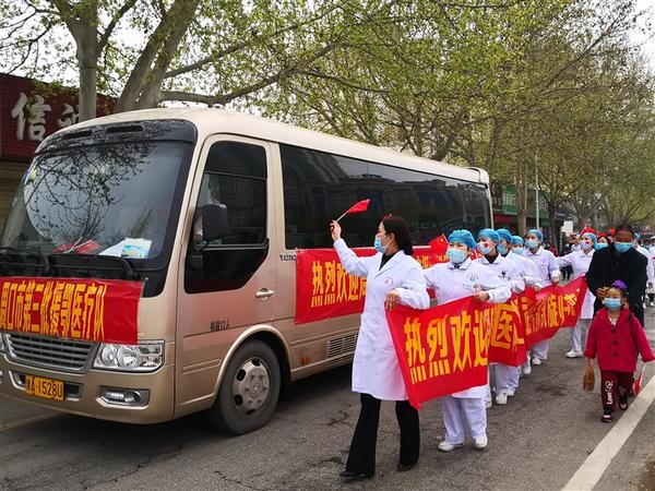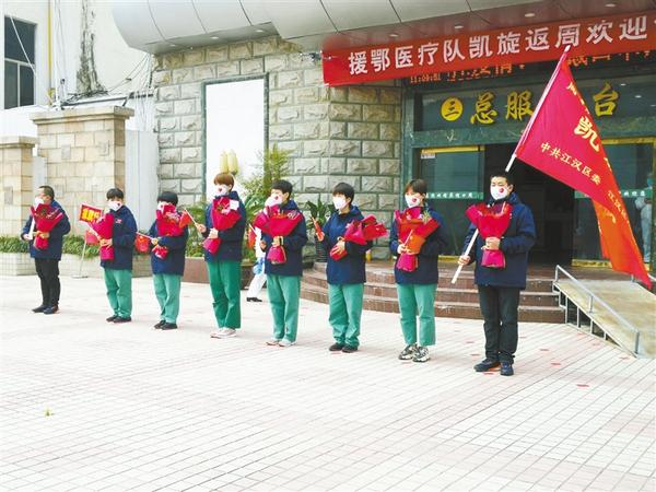 3月3日,周口港区医院的8名医务人员临危请战,奔赴武汉,对口支援武汉江汉区商职医院,开展对新冠肺炎患者的临床救治和护理工作。江汉区是商业中心,人口密度较大,是疫情的重灾区。在连日的工作中,由于防护服密不透风,几名队员的身上长满了湿疹,严重的皮肤都溃烂了。尽管如此,队员们仍克服重重困难,以精湛的医术和较高的职业素养,交出了一份胜利的答卷——战“疫”期间,他们累计收治117名新冠肺炎患者,其中包括数名重症患者,实现了医务人员零感染、患者零死亡。临别时,中共江汉区委、江汉区人民政府授予他们一面凯旋旗,武汉市书法家协会赠送了一幅写有“江城无恙 感恩有你”的墨宝。