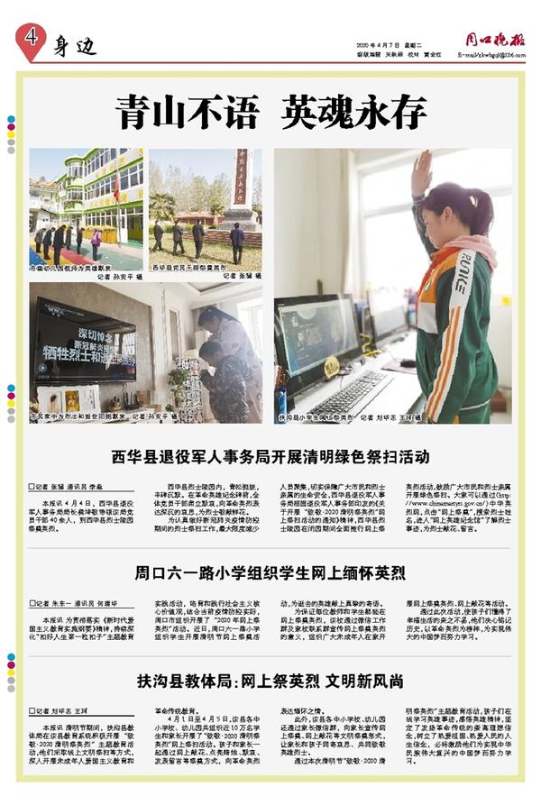 本报讯 清明节期间,扶沟县教体局在该县教育系统积极开展“致敬·2020清明祭英烈”主题教育活动,他们采取线上文明祭扫等方式,深入开展未成年人爱国主义教育和革命传统教育。