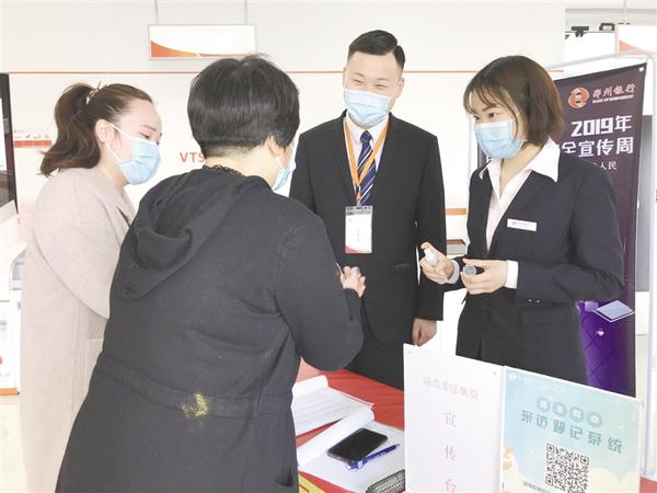 近日,郑州银行周口分行以科学防控为前提,以客户需求为导向,坚持疫情防控和金融服务两手抓,不但为疫情防控搭建起畅通无阻的金融服务绿色通道,而且为客户的金融需求筑起坚实的金融后盾。图为4月6日该行员工为前来办理业务的市民消毒、测体温。