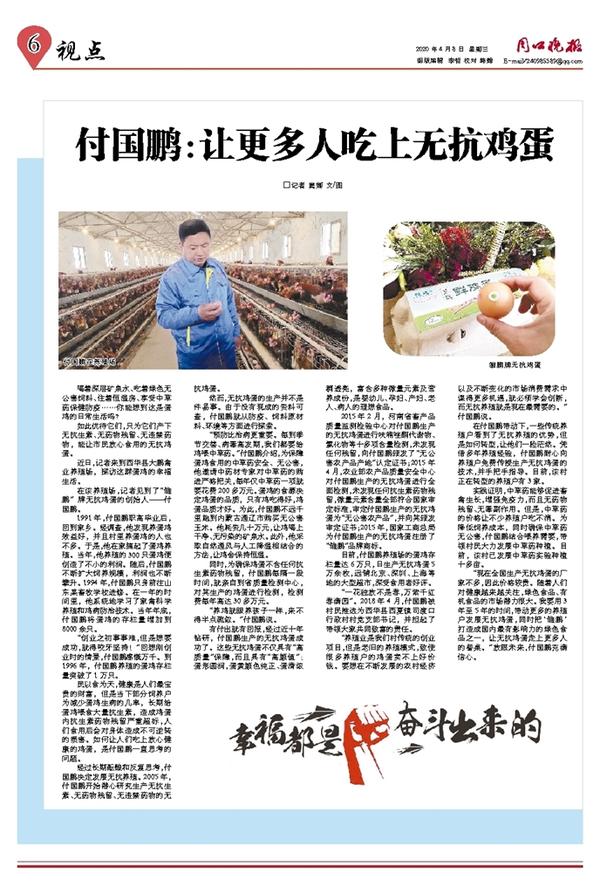 “现在全国生产无抗鸡蛋的厂家不多,因此价格较贵。随着人们对健康越来越关注,绿色食品、有机食品的市场潜力很大。我要用3年至5年的时间,带动更多的养殖户发展无抗鸡蛋,同时把‘雏鹏’打造成国内最有影响力的绿色食品之一,让无抗鸡蛋走上更多人的餐桌。”放眼未来,付国鹏充满信心。