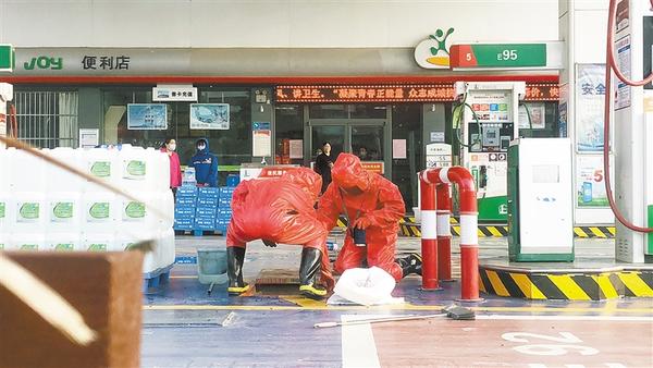 由于地处加油站,无法用火攻,2名消防员佩戴好个人防护装备,手拿杀虫剂对马蜂进行灭杀。10分钟后,所有马蜂被清理一空。记者 王凯 摄