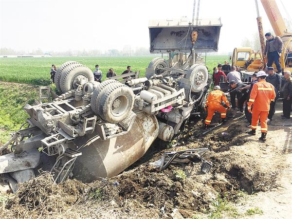 4月7日9时,沈丘县李老乡刘堂村附近一辆搅拌车翻入沟内,司机被困。接到报警后,沈丘县消防救援大队立即前往救援。