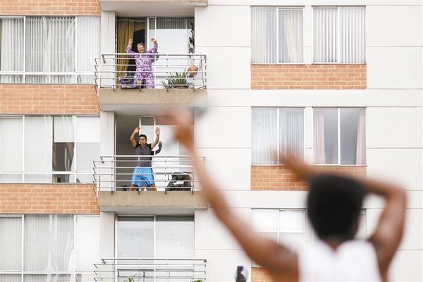 4月7日,在哥伦比亚波哥大一个小区内,居民在阳台上做操。