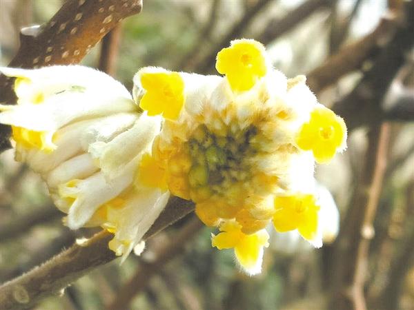 花在枝条的顶端,一朵朵小小的明黄色的花儿簇拥成一个个花球,毛茸茸的,挂在枝头,似一个个小婴儿梦中绽放的微笑,可爱极了。结香先开花,后长叶。褐色的枝条没有叶子的覆盖,在娇艳花朵的对比下,感觉很沧桑。尤其是那几枝弯弯绕绕地打着结的枝条,虽然扭曲着,却也超越疼痛努力地在向上生长,那一个个结也长成枝的一部分,开出一簇簇明艳的花朵。