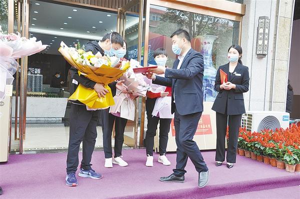 10时许,段传功、李慧、孙慧慧回到小区,石凯丽的亲属也随后到来。金泰王朝销售经理胡芳芳带领工作人员向他们献花,并引领他们到售楼部休息。段传功等队员于2月21日离开周口奔赴武汉抗疫最前线,3月30日凯旋,之后在周口迎宾馆隔离休整,已有50多天没和家人团聚。看到隆重的场面及欢迎的人群,段传功等队员既高兴又激动。
