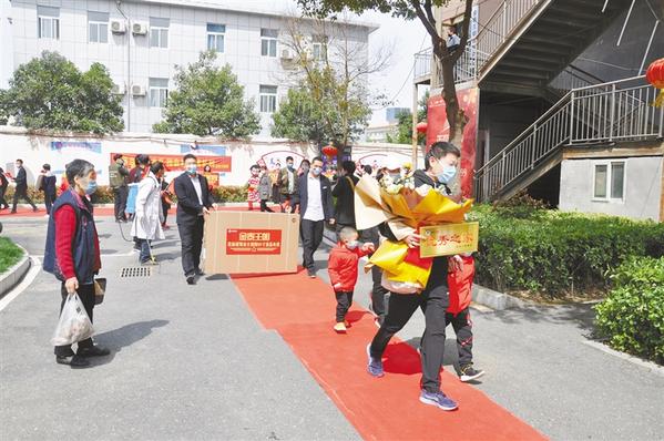 当天的金泰王朝小区干净整洁,处处洋溢着节日喜庆气氛。小区内植被葳蕤,路面一尘不染,当日一大早,几十名物业人员各司其职,在忙碌着欢迎仪式的准备工作。据了解,该小区共有4名援鄂医疗队队员,分别是段传功、李慧、孙慧慧、石凯丽。由于石凯丽隔离期未到,当日只有段传功等3名队员解除隔离回到小区。很快,数百米的大红地毯从小区大门,一直铺到段传功等4名队员所在楼栋的单元入户门前。小区门前盘鼓阵阵,工作人员和业主自发组成欢迎队伍,大家手挥国旗列队等候,小区大门外成了欢乐的海洋。