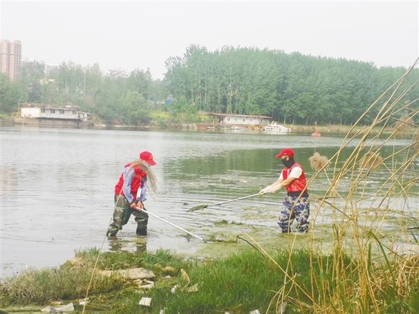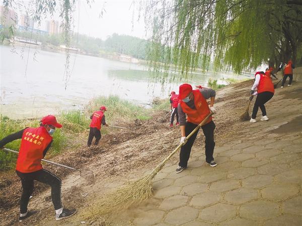 本报讯 4月17日下午,中心城区八一大道桥东的沙颍河南路一片繁忙景象,市慈孝文化促进会的30名志愿者来到这里,有的发放调查问卷,有的拿着笤帚、耙子、编织袋等清理岸边的垃圾,打捞河面漂浮物,展开第57次沙颍河岸清漂行动。