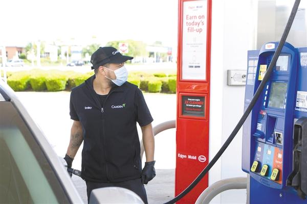 当地时间4月20日,在美国得克萨斯州达拉斯北郊,一名戴口罩的男子为车加油。