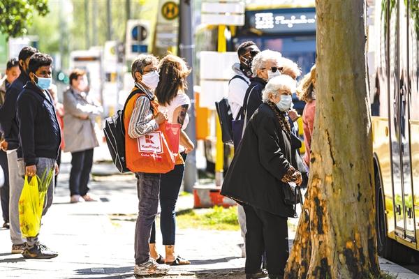 4月27日,在德国柏林,人们戴着口罩等候公交车。德国各联邦州要求居民4月27日起至少在乘坐公共交通时戴口罩。新华社发