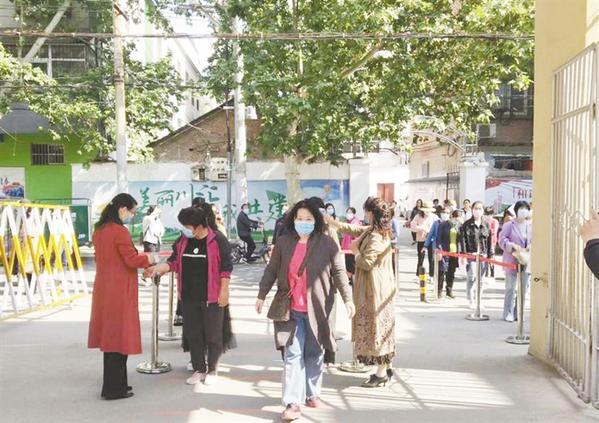 “‘同学们’,请戴好口罩,主动报告自身情况,按地面标识间隔一米以上排队站好,并进行手部消毒、物品消毒,请有序进入校园。”4月29日上午,周口六一路小学举行疫情防控返校复学演练。该校全体教师扮成学生,在工作人员的指引下,排队消毒、检测体温……然后,体温正常的“学生”方可进入校园。随后,该校针对发现体温异常的“学生”,进行模拟演练。