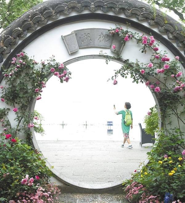 5月5日,游客在西湖畔的郭庄观看月季花展。