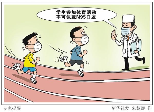 随着疫情防控形势持续好转,全国各地陆续开学复课。有些家长为了更好地保护孩子,让孩子佩戴N95口罩上学,个别孩子甚至佩戴N95口罩进行体育锻炼。专家提醒,少年儿童的心肺功能尚未发育完全,长期佩戴N95口罩会对孩子的心肺功能产生损伤,进行体育运动时不可佩戴N95口罩,以免发生窒息危险。新华社发 朱慧卿 作