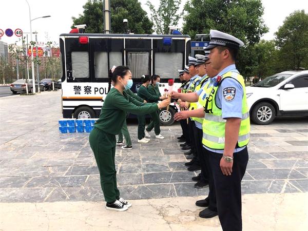 5月5日,郸城县小牛津幼儿园的教师带着矿泉水、鲜花等慰问品,来到郸城县交警大队城市一中队执勤岗点,慰问一线执勤交警,表达对他们的敬意。记者 徐松 通讯员 王中华 摄
