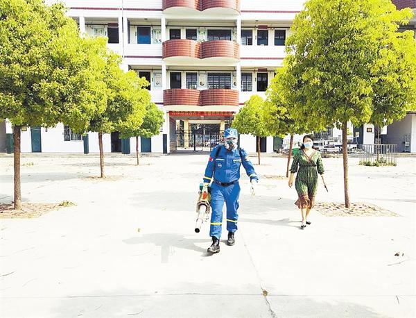 5月13日,我市中心城区小学低年级学生将迎来返校复课。为保障孩子们的身体健康,5月10日,周口六一路小学邀请周口市蓝天救援大队的工作人员对校园重点部位进行消毒杀菌,为低年级师生顺利返校复课提供健康保障。通讯员 刘芝 摄