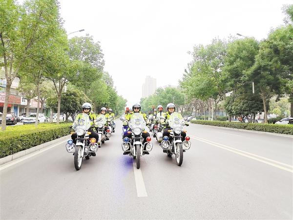 图为巡逻中的铁骑队。穿着醒目的骑行服、骑着帅气的摩托车,穿梭在街头巡逻执法……市公安局交通管理支队铁骑队是周口这座文明城市的亮丽“风景线”,更是一抹流动的“平安色”。据了解,铁骑队2018 年9月开始组建,目前有正式民警6人,辅警8人,警用摩托10辆,配有警用头盔、骑行服、执法记录仪。他们主要执行各类重大交通警卫任务,并且作为应急力量紧急处置各类突发事件。自成立以来,铁骑队圆满完成援鄂医疗队护航、新中国成立70周年国庆安保、周口马拉松比赛以及高考执勤、护学岗勤务等任务。记者 陈永团 姬慧洋 摄