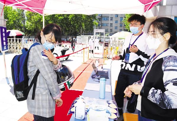 5月18日,山东大学返校学生(左)在进行入校登记。 当日,山东大学迎来新学期首批返校学生。为妥善做好返校工作,学校提前设立入校通道、测温门、行李消杀点、身份核验点、核酸检测点和临时滞留点等,在保证疫情防控的基础上有序进行学生返校工作。 新华社记者 王凯 摄