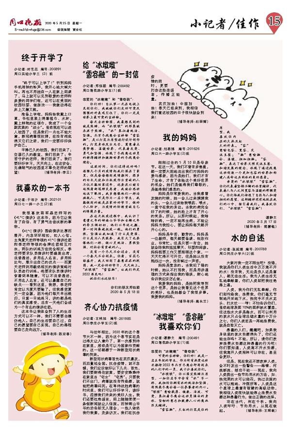 这段时间,你们过得还好吗?连续几个月的疫情把我们困在了家里,但是每每想到疫情期间,很多的白衣天使和为抗疫作出贡献的人不仅不能回家过年,还要夜以继日地照看新冠肺炎患者,我就会感动地流下眼泪。我多想像他们一样治病救人,可是作为一名小学生,我能做到的就是在家好好学习,做好个人防护,为疫情的防控贡献自己的绵薄力量。