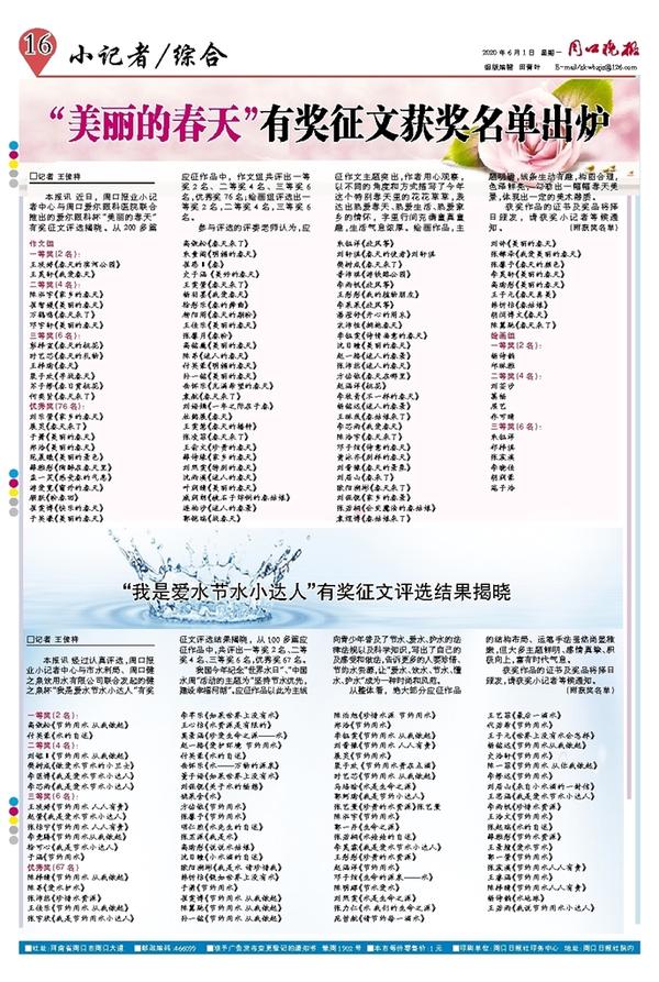 本报讯 经过认真评选,周口报业小记者中心与市水利局、周口健之泉饮用水有限公司联合发起的健之泉杯“我是爱水节水小达人”有奖征文评选结果揭晓,从100多篇应征作品中,共评出一等奖2名、二等奖4名、三等奖6名,优秀奖67名。