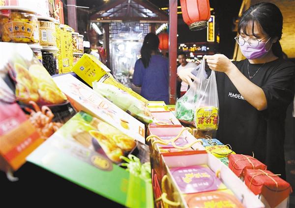 游客在开封鼓楼夜市一个摊位前选购特产(6月1日摄)。