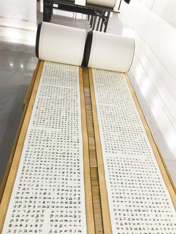据了解,在此次参展作品中,100万字的大乘佛教经典《华严经》,是我市著名作家朱广辉于2019年3月至2020年2月,历时11个月抄录的小楷书法作品,全卷长1112米。
