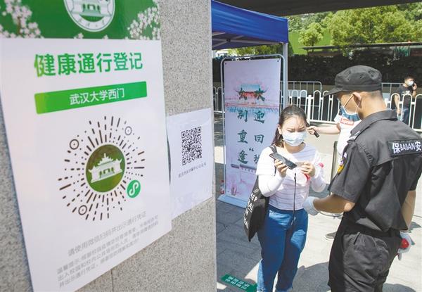 6月8日,在武汉大学西门,返校学生扫健康码进入校园。