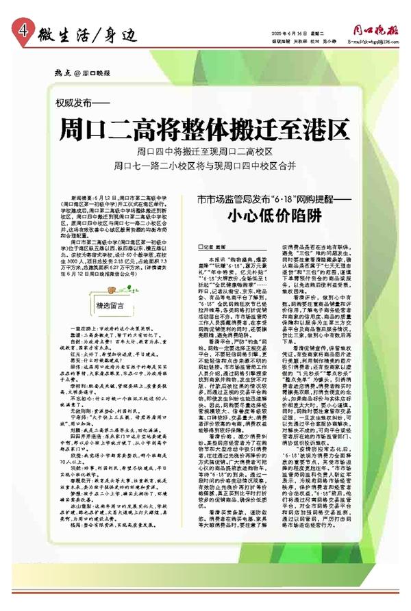周口市第二高级中学(周口港区第一初级中学)位于港区纵五路以西、纵四路以东、横五路以北。该校为寄宿式学校,设计60个教学班,在校生3000人,项目总投资2.18亿元,占地面积7.3万平方米,总建筑面积6.27万平方米。(详情请关注6月12日周口晚报微信公众号)
