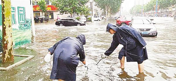 此外,市区各排水泵站也全速运行,加大马力抽排水。泵站自动化监控中心密切关注各泵站数据和设备运行状态,加强对易涝点的监控,及时掌握水情,进行调度和处置内涝。通过采取科学调度泵站排水、打开应急闸门、打开部分沟渠围堰、打通荷花泵站被封堵的雨水排口等措施,全力保障了市区的正常排水。在市区积水严重路段,市城管局抢修人员打开窨井盖,派专人看护,加快积水排放,待积水排除后及时恢复原状,确保路面安全通行(如图)。
