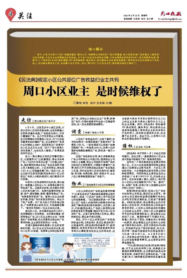 如今,小区内五花八门的广告越来越多,楼内大厅、电梯等公共部位的广告已很普遍,但小区物业接广告时基本上都没经过业主同意,小区业主也没得到过任何收益。对于这个社会关注的热点问题,今年全国两会审议的《中华人民共和国民法典(草案)》(以下简称《民法典》)物权编第282条明确规定:建设单位、物业服务企业或者其他管理人等利用业主的共有部分产生的收入,在扣除合理成本之后,应当属于业主共有。所以,周口的广大小区业主们,是时候为咱自己维权了。