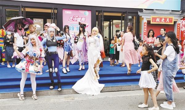 6月20日,中心城区五一路某商场前,一群少女扮演的动漫人物或时尚清纯,或怪异搞笑,吸引市民关注,纷纷拿出手机拍照。记者 孙安平 摄