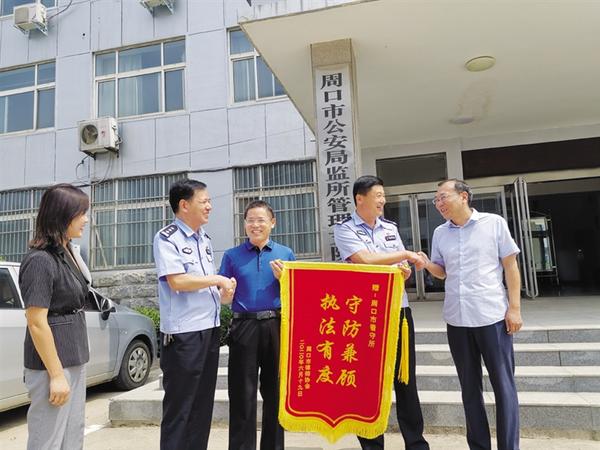 本报讯 6月24日上午,周口市律师协会副会长赵明、马学斌、胡宁等人将一面锦旗送到周口市看守所,感谢疫情防控期间看守所为律师会见工作提供周到的服务。