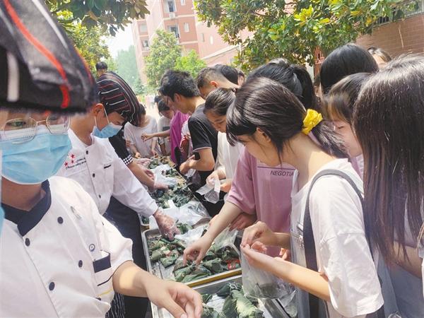 6月25日,在周口技师学院校园内,学生争相领取热腾腾的粽子。