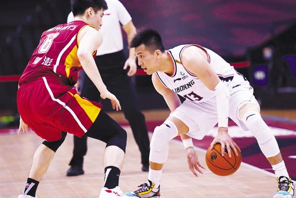 6月27日,辽宁本钢队球员郭艾伦(右)在比赛中伺机突破。