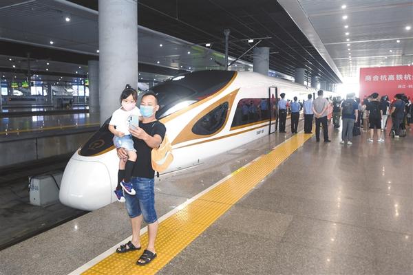 6月28日,在杭州东站,乘坐商合杭高铁杭州至合肥段首发列车的旅客在登车前留影。