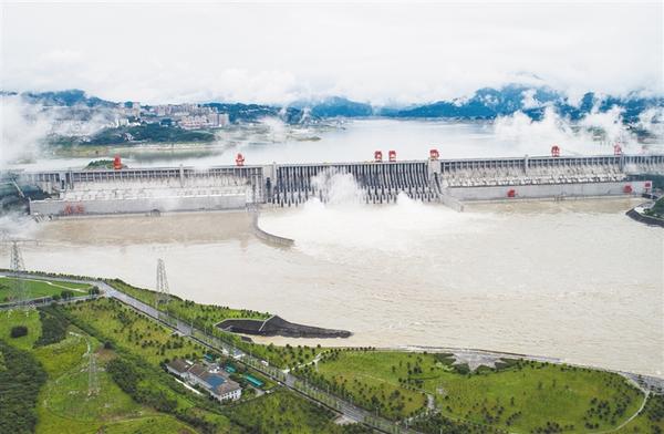 6月29日,三峡枢纽开启泄洪孔泄洪。