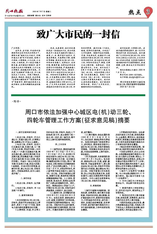 (一)宣传发动、摸底排查阶段(2020年7月2日至7月31日)。7月2日至7月15日,将《周口市依法加强中心城区电(机)动三轮、四轮车管理工作方案(征求意见稿)摘要》在《周口日报》、周口广播电视台、《周口晚报》及所属新媒体发布,广泛征求群众意见。7月16日至7月31日,采取多种形式,深入宣传我市依法加强中心城区电(机)动三轮、四轮车管理的必要性,使禁行区域、路段和各项配套保障措施家喻户晓、人人皆知,营造氛围、形成共识,取得社会各界和广大群众的理解和支持。同时,各区、管委会组织人员登门入户,对辖区电(机)动三轮、四轮车进行调查摸底,分类统计,登记造册。