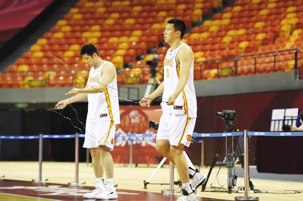 7月8日,山西汾酒股份队球员闫鹏飞(右)进行赛前热身。